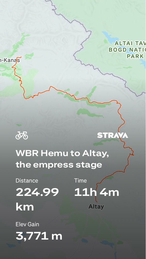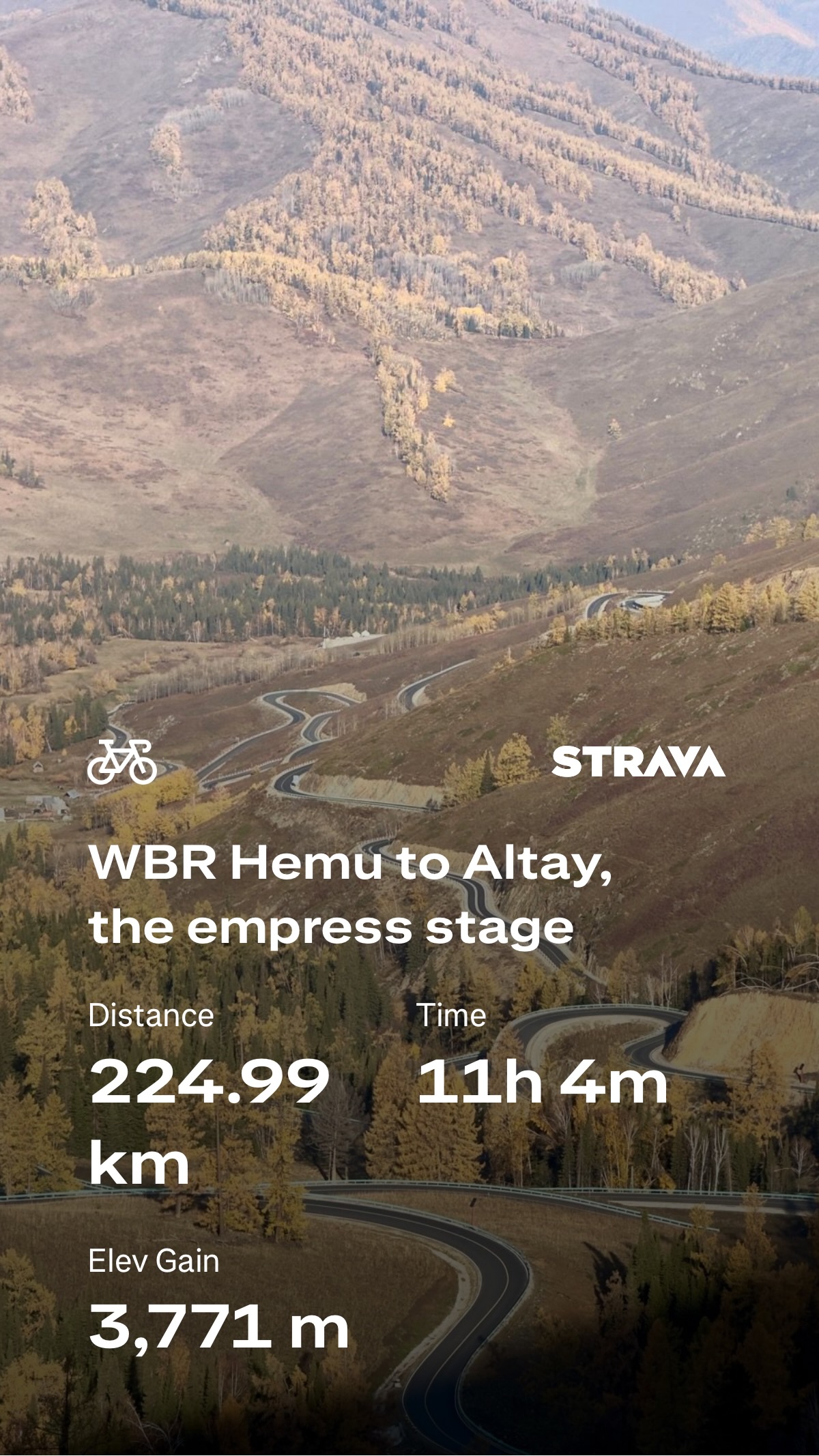 Hemu to Altay along the G681 Ahu Highway. Amazing road and needs to be on your bucket list of China rides. Could split into a few days and explore the side roads. Enough said, go and ride it outside of the tourist season! Be prepared, the weather can change quickly! 从禾木到阿勒泰,沿着G681阿禾公路前行。这条公路令人惊叹,绝对值得列入你的中国骑行清单。可分几天完成,顺道探索支线道路。无需多言,趁着非旅游旺季出发吧!做好准备,天气可能瞬息万变!